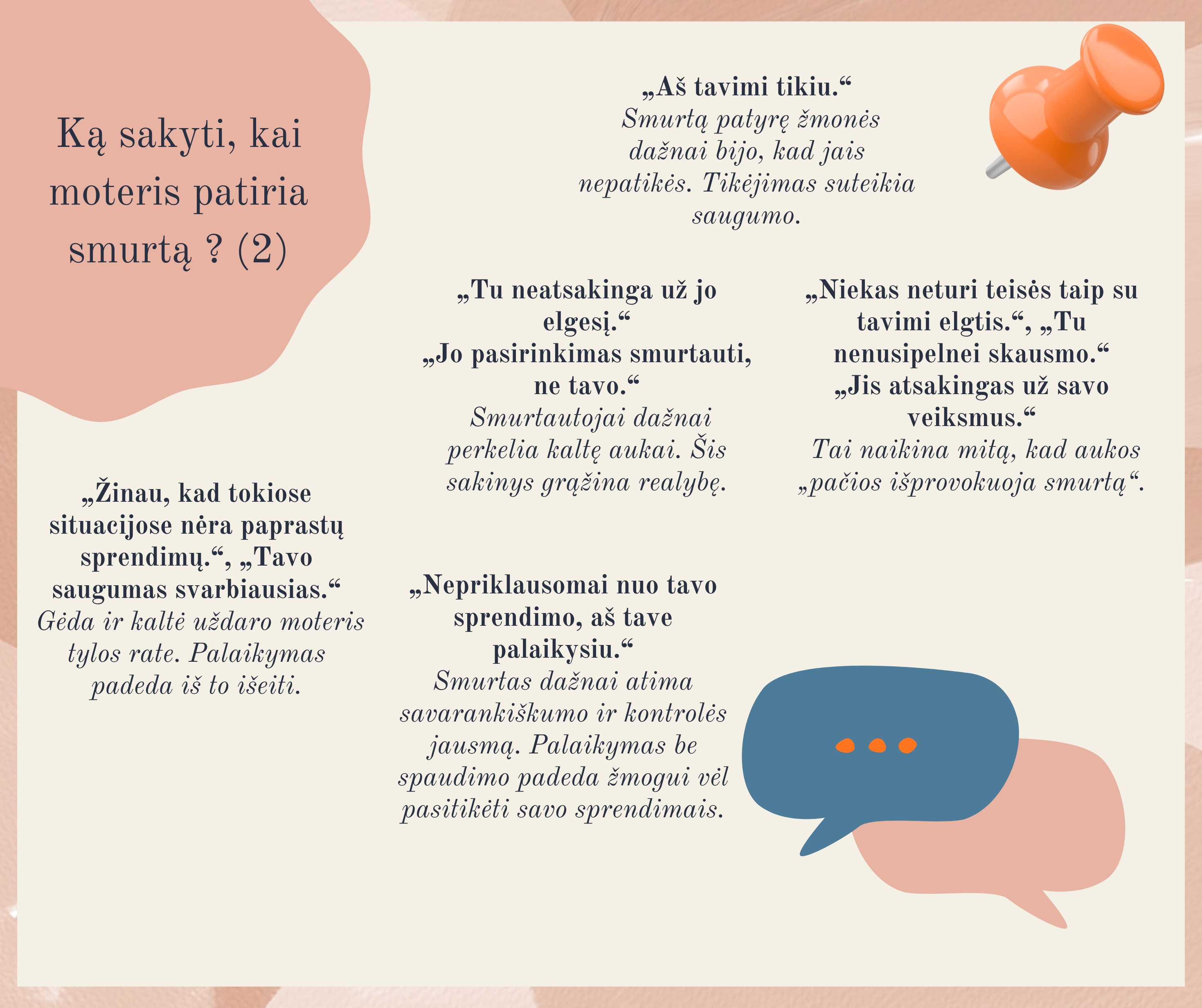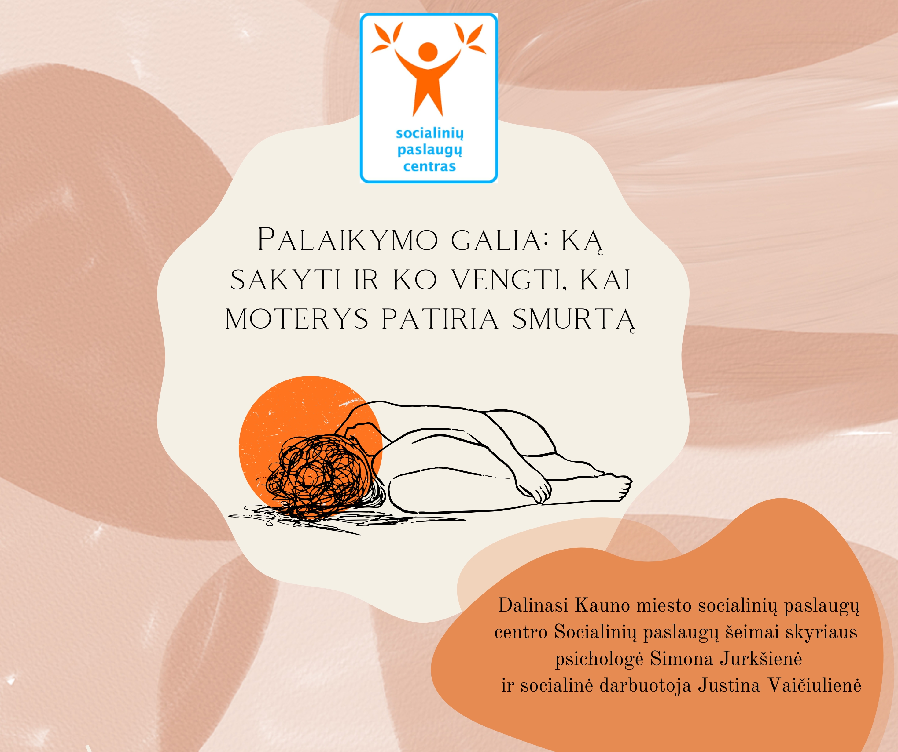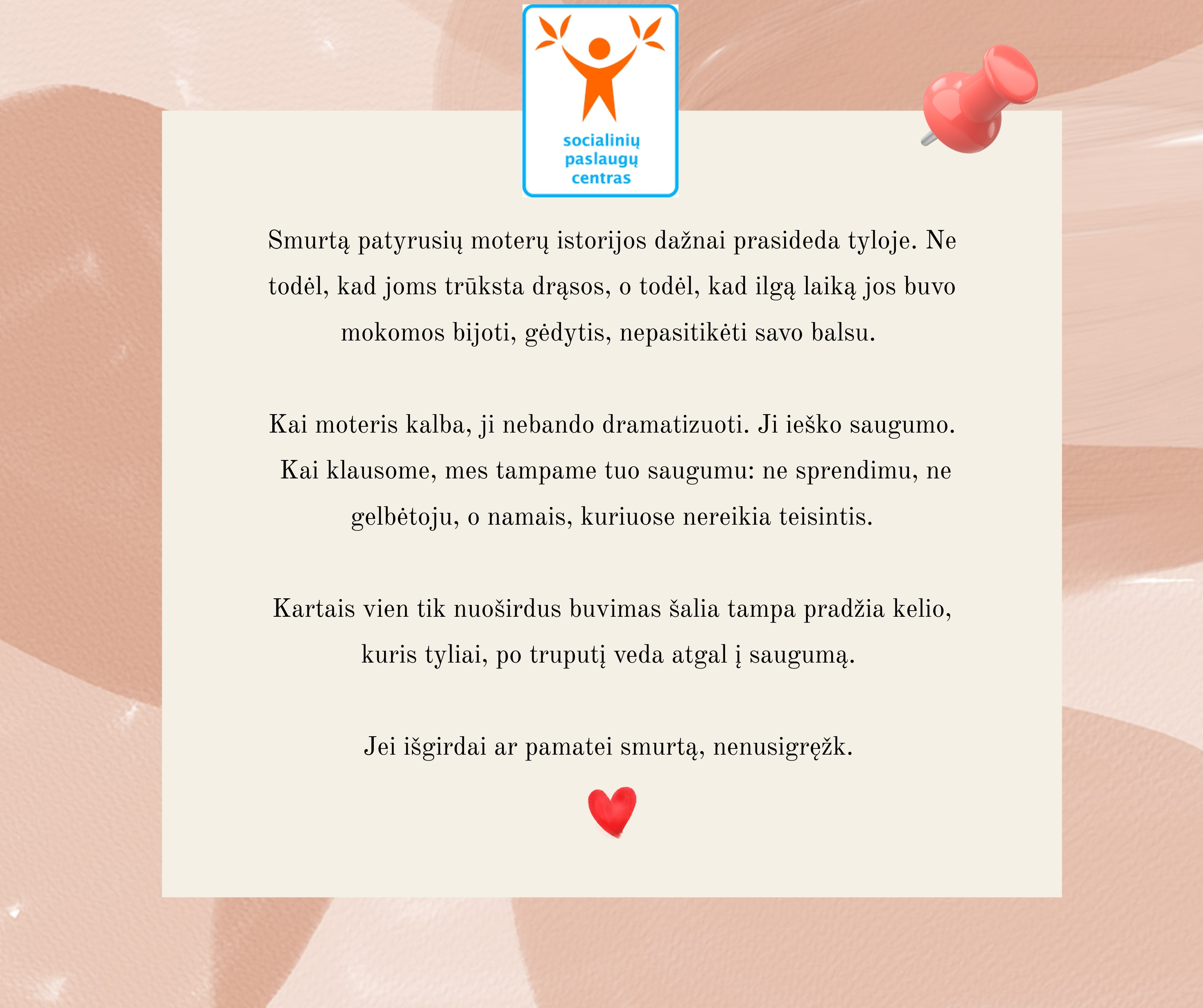 Kauno miesto socialinių paslaugų centro Socialinių paslaugų šeimai skyriaus psichologė Simona Jurkšienė ir socialinė darbuotoja Justina Vaičiulienė dalinasi informacija, ką sakyti ir ko vengti, kai moteris patiria smurtą, kaip mūsų žodžiai gali padėti arba, priešingai, užverti duris pagalbai. Smurtą patyrusios moters istorija dažnai prasideda tyloje. Ne todėl, kad trūksta drąsos, o todėl, kad ji ilgą laiką buvo mokoma bijoti, gėdytis ir tylėti. Kai moteris išdrįsta prabilti, ji ieško saugumo, o ne greitų sprendimų. Klausydamiesi be kaltinimo ir vertinimo tampame tuo saugumu, kuris padeda jai žengti pirmą žingsnį pirmyn į pasitikėjimą bei saugumą. Palaikymo galia sudėtingose, smurtinėse situacijose didelė. Ji gali sumažinti gėdą, išsklaidyti izoliaciją, paskatinti ieškoti pagalbos ir net išgelbėti gyvybę.