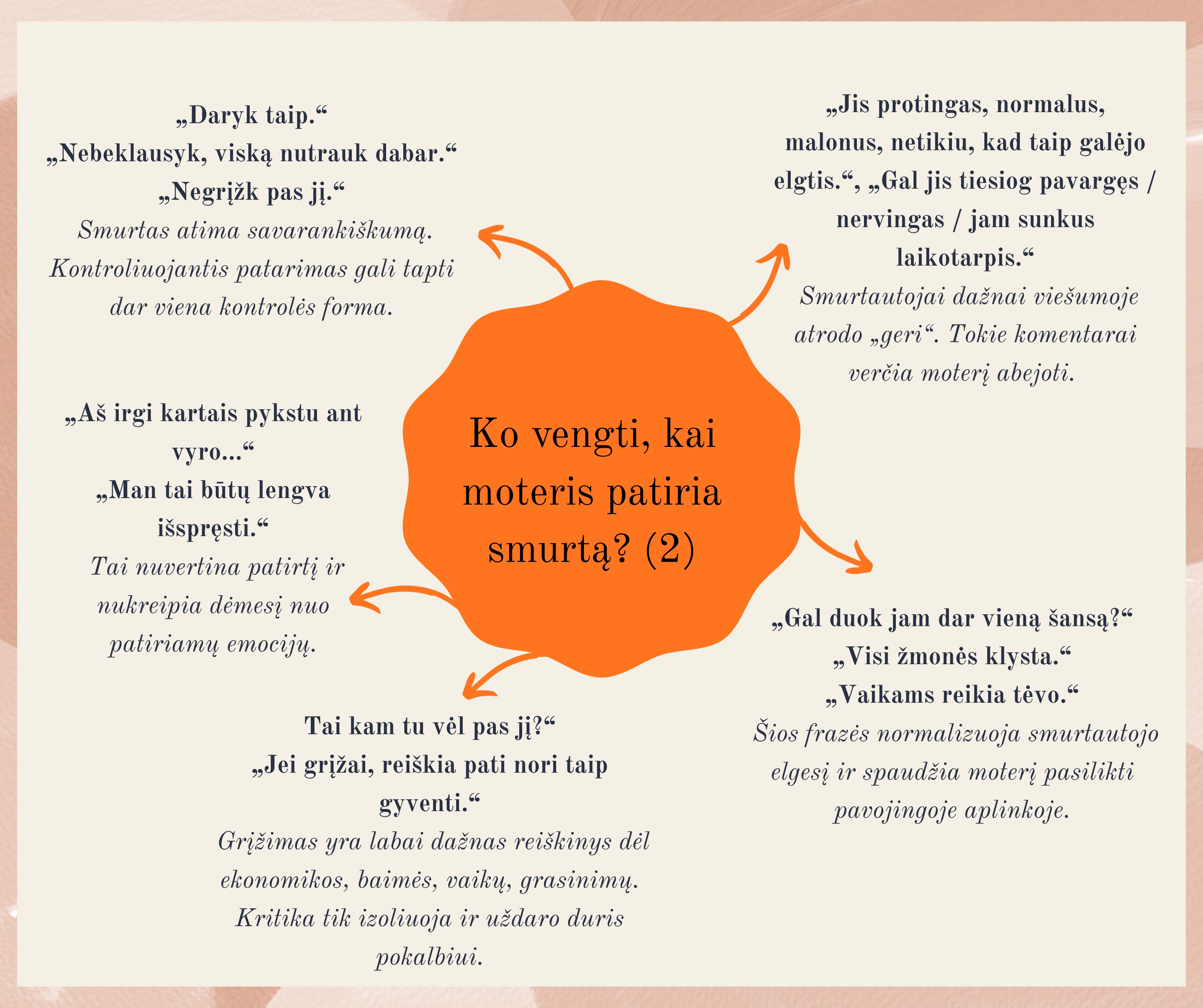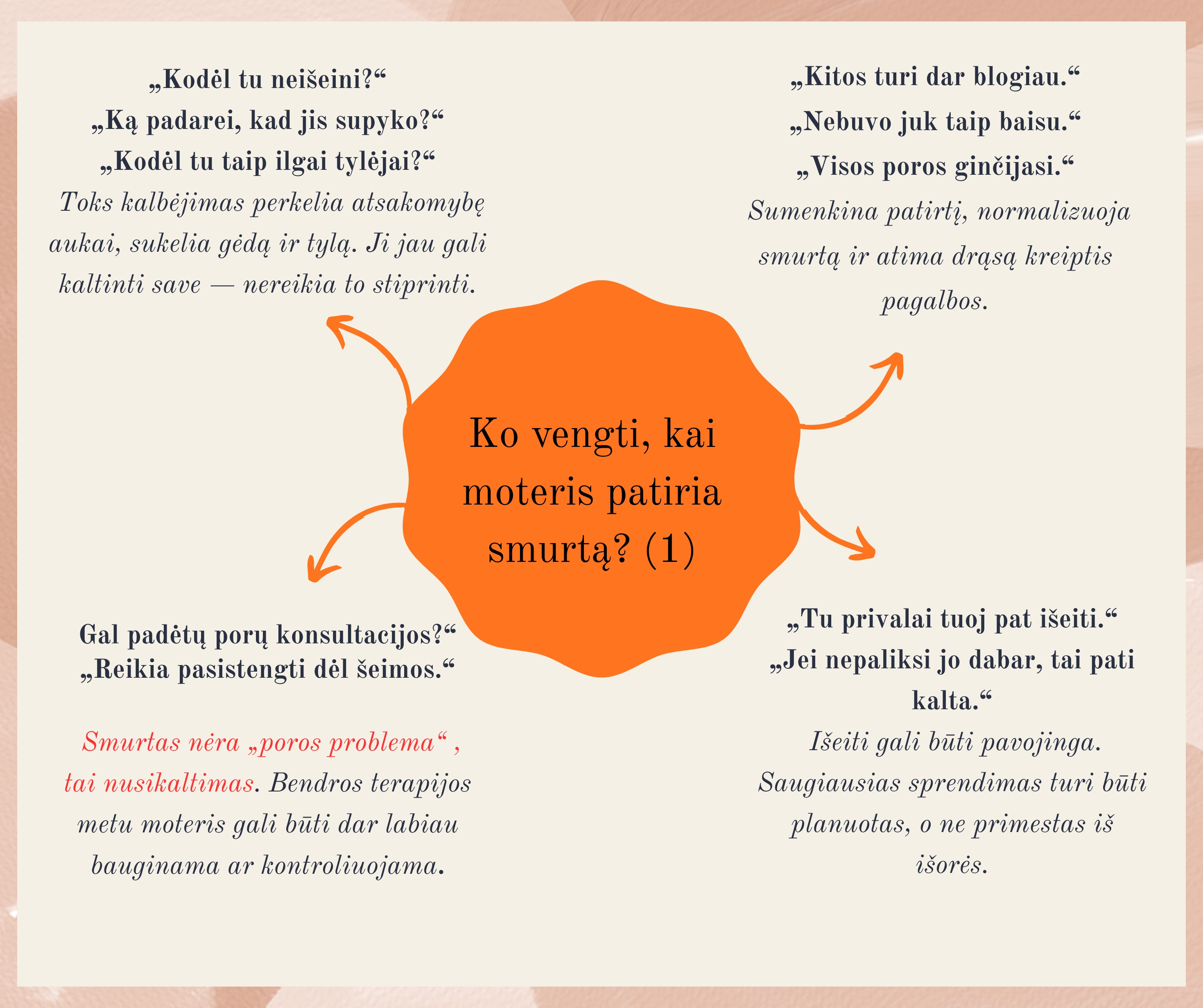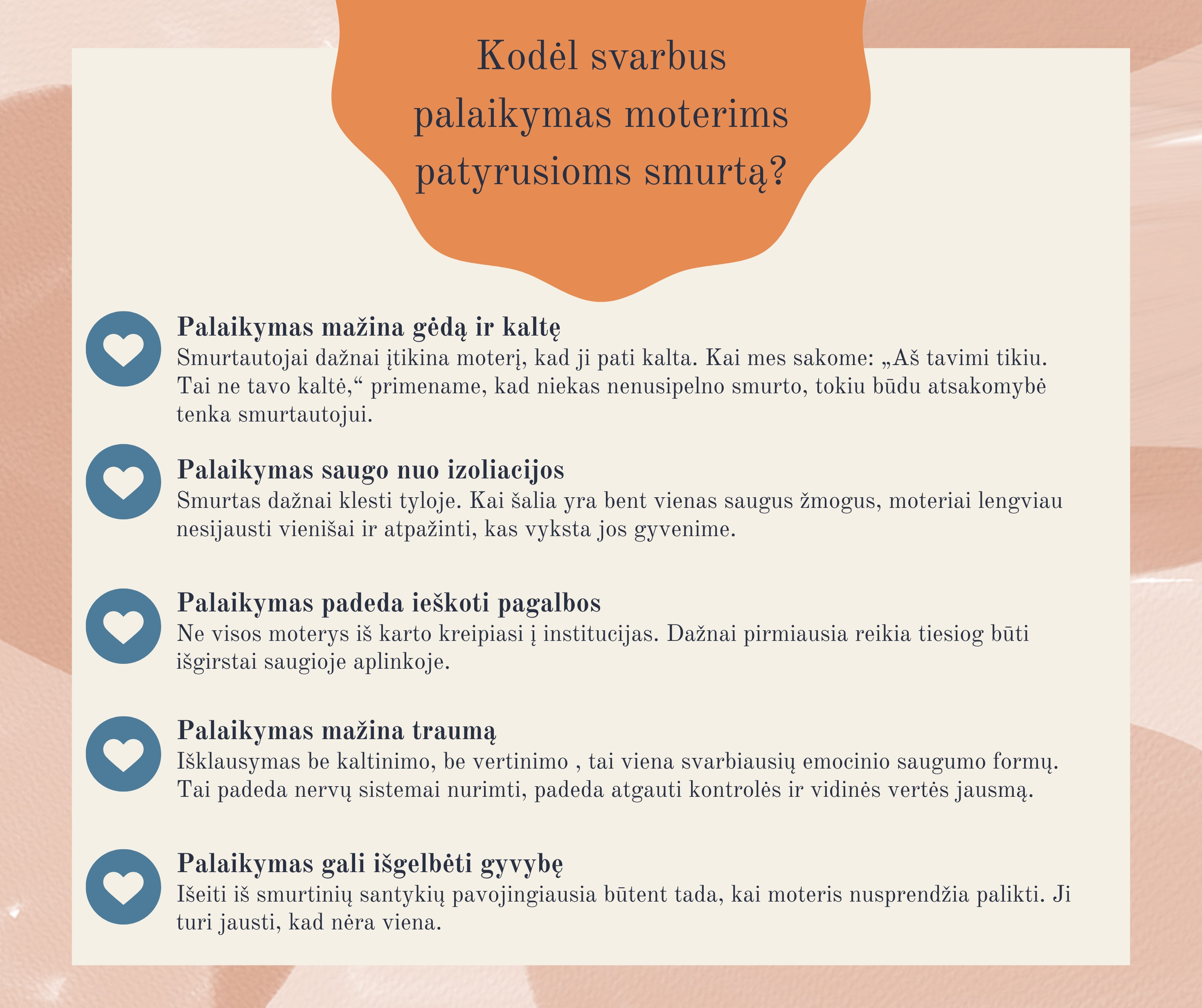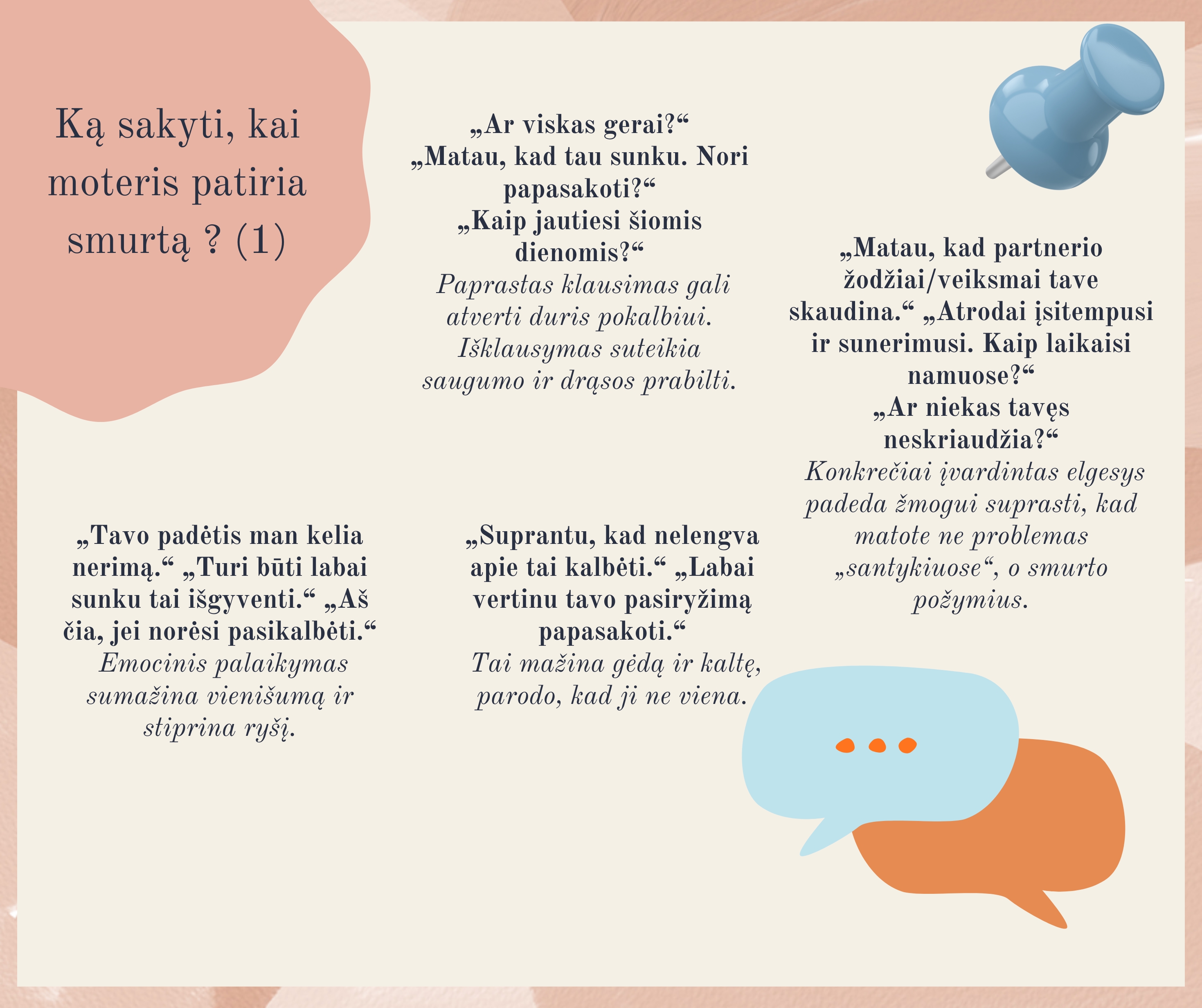 Kauno miesto socialinių paslaugų centro Socialinių paslaugų šeimai skyriaus psichologė Simona Jurkšienė ir socialinė darbuotoja Justina Vaičiulienė dalinasi informacija, ką sakyti ir ko vengti, kai moteris patiria smurtą, kaip mūsų žodžiai gali padėti arba, priešingai, užverti duris pagalbai. Smurtą patyrusios moters istorija dažnai prasideda tyloje. Ne todėl, kad trūksta drąsos, o todėl, kad ji ilgą laiką buvo mokoma bijoti, gėdytis ir tylėti. Kai moteris išdrįsta prabilti, ji ieško saugumo, o ne greitų sprendimų. Klausydamiesi be kaltinimo ir vertinimo tampame tuo saugumu, kuris padeda jai žengti pirmą žingsnį pirmyn į pasitikėjimą bei saugumą. Palaikymo galia sudėtingose, smurtinėse situacijose didelė. Ji gali sumažinti gėdą, išsklaidyti izoliaciją, paskatinti ieškoti pagalbos ir net išgelbėti gyvybę.